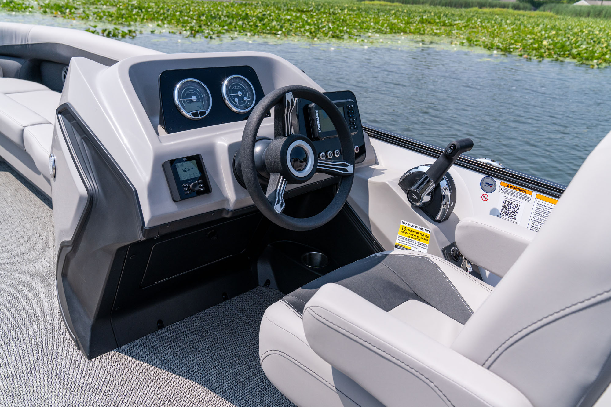 Fire ExtinguisherHighback, Reclining, Helm Seat with Swivel and SlideHighback, Reclining, Helm Seat with Swivel and SlideHook 4 GPS Plotter/FishfinderIntegrated Cell Phone Storage with AUXSteering Wheel